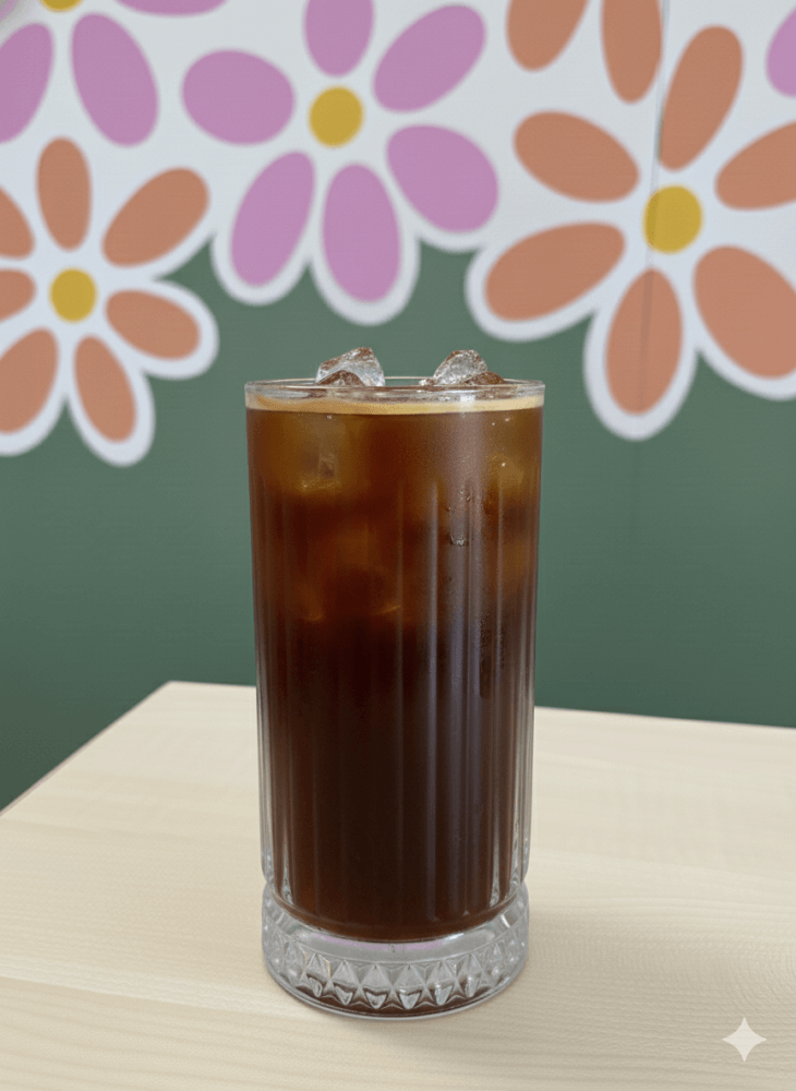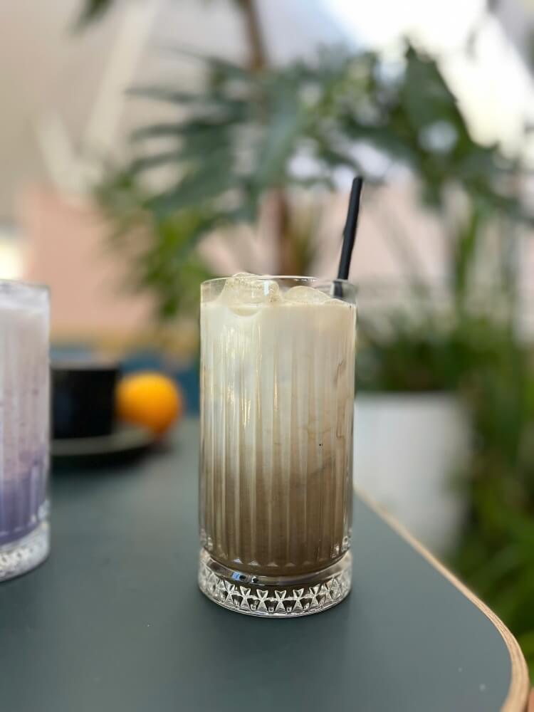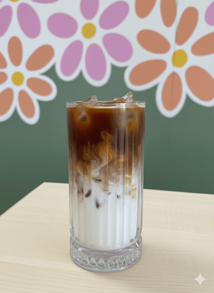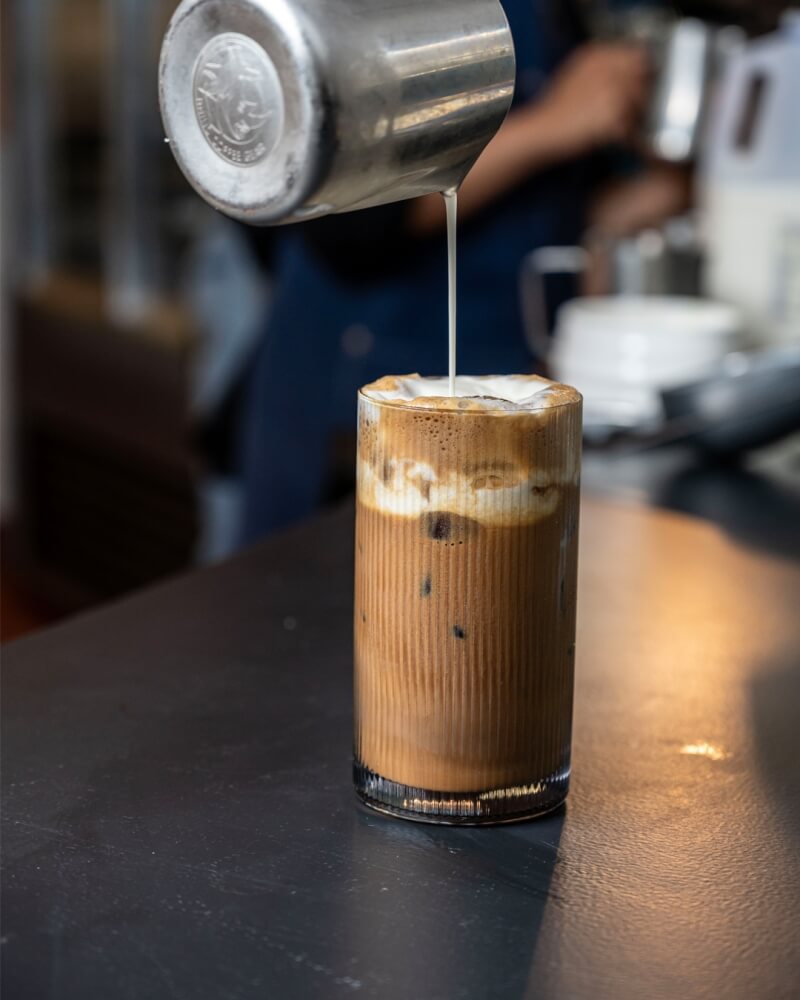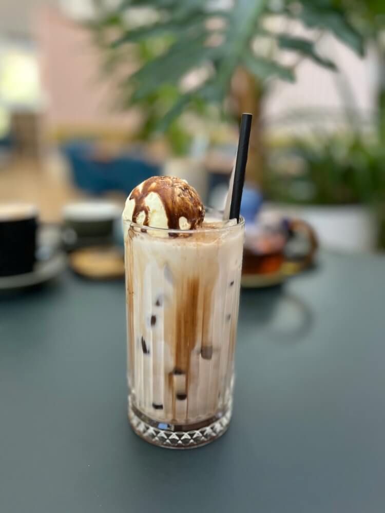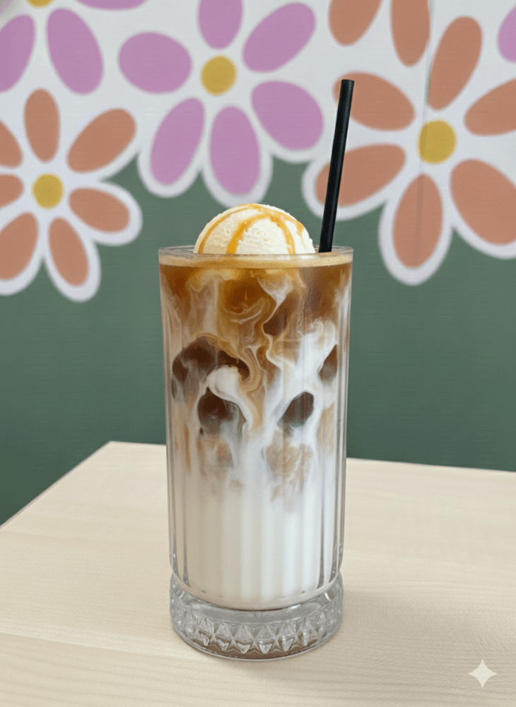 A chilled espresso over cold milk and ice, finished with a scoop of creamy vanilla ice cream