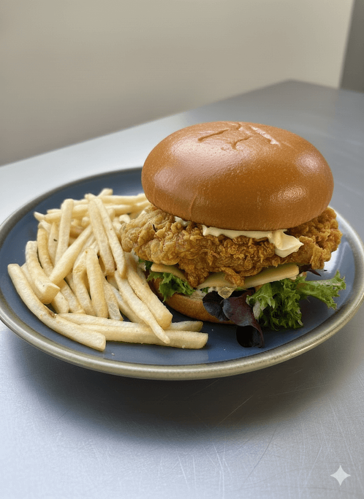 Crispy fry chicken served on a soft brioche bun with cheese and fresh lettuce, house made mayo, side of fries