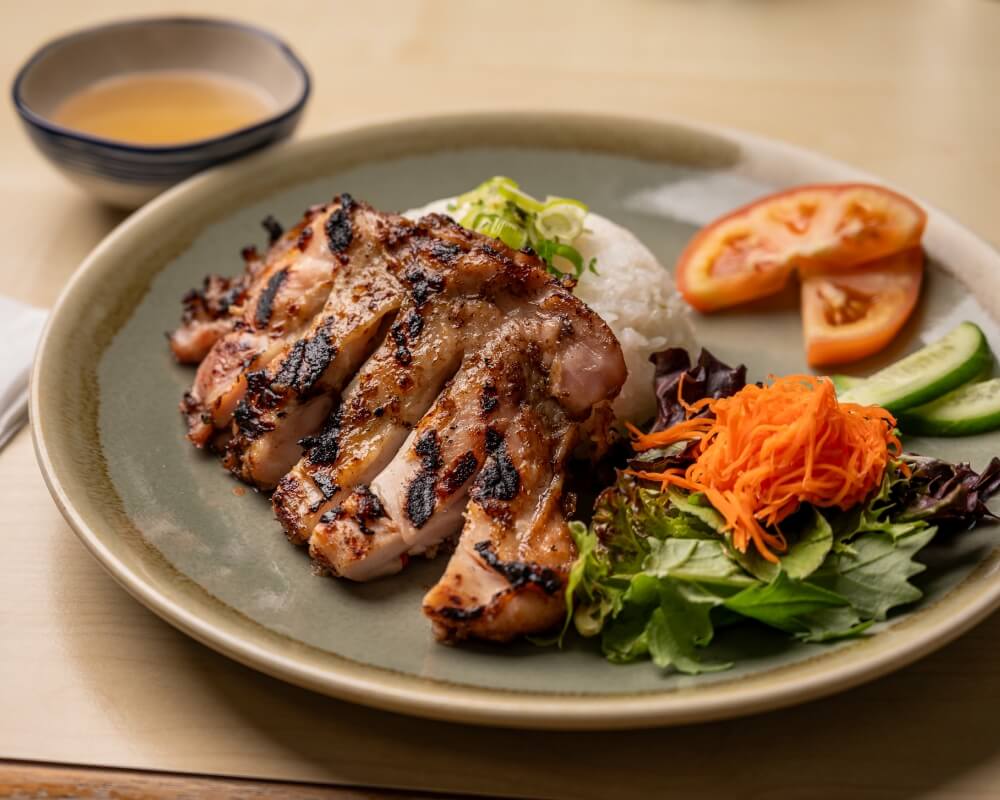 Juicy grilled chicken to order on a bed of jasmine rice topped with spring onion oil and served with seasonal salad and fish sauce. A sure bet!