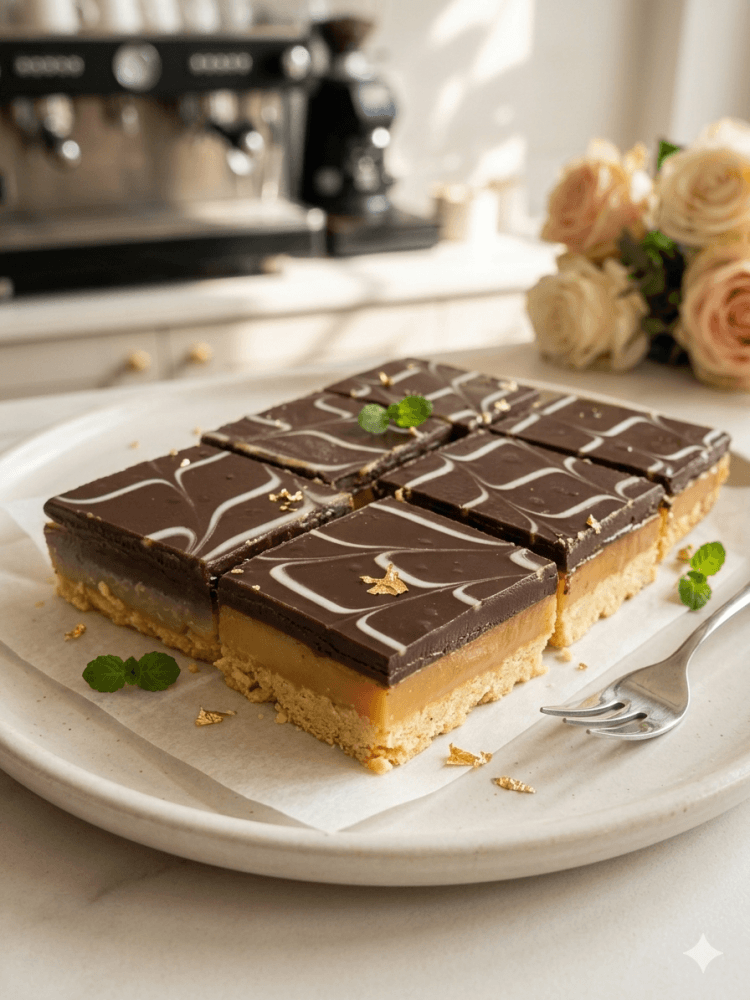 Crunchy biscuit base, rich caramel center, and smooth chocolate topping.