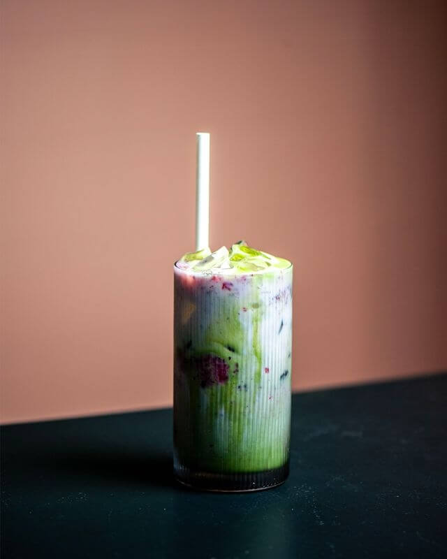 Mixed berries coulis topped with your milk of choice and matcha.
