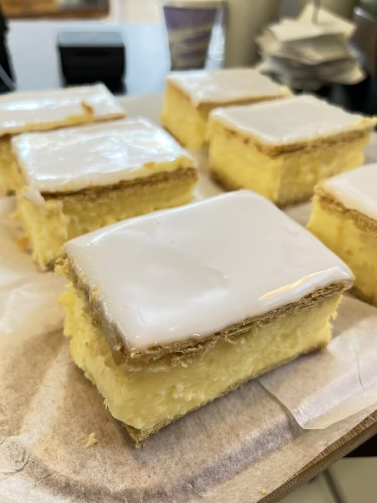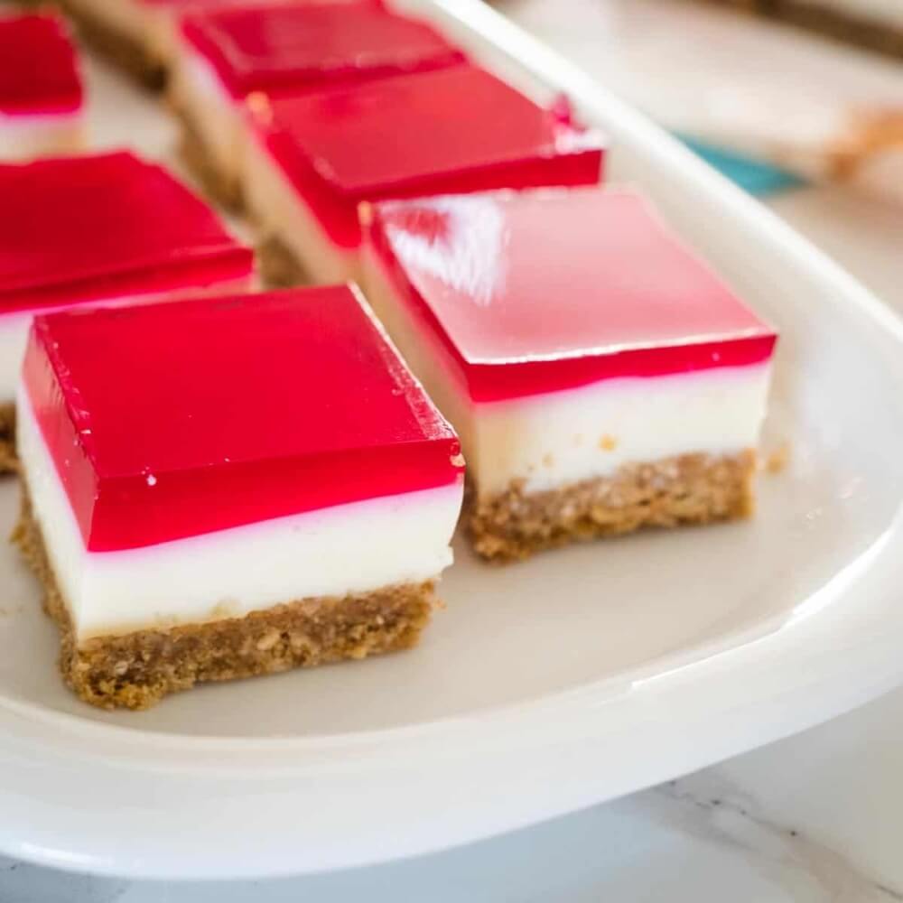 Sweet treat with a biscuit base, creamy layer, and fruity jelly top.