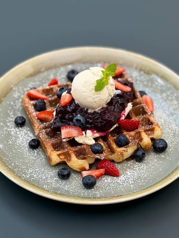 Toasted to a perfect crunch and topped with fresh seasonal fruit, silky cream, and a classic scoop of vanilla ice cream.