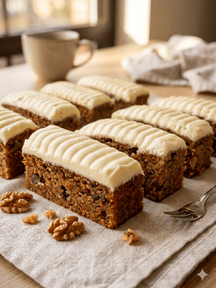 A moist spiced treat with grated carrot, topped with creamy icing.