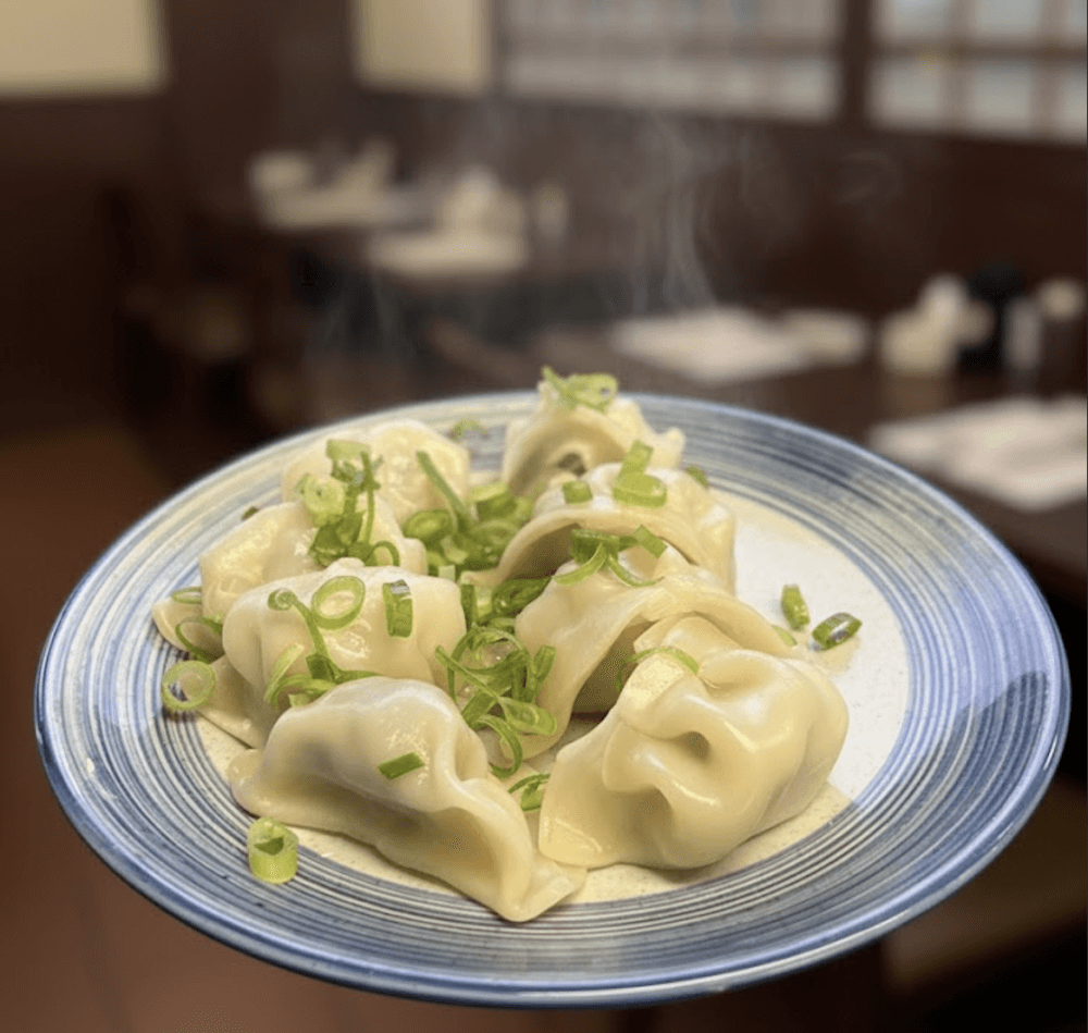 Steamed dumplings, spring onion and soy dipping sauce