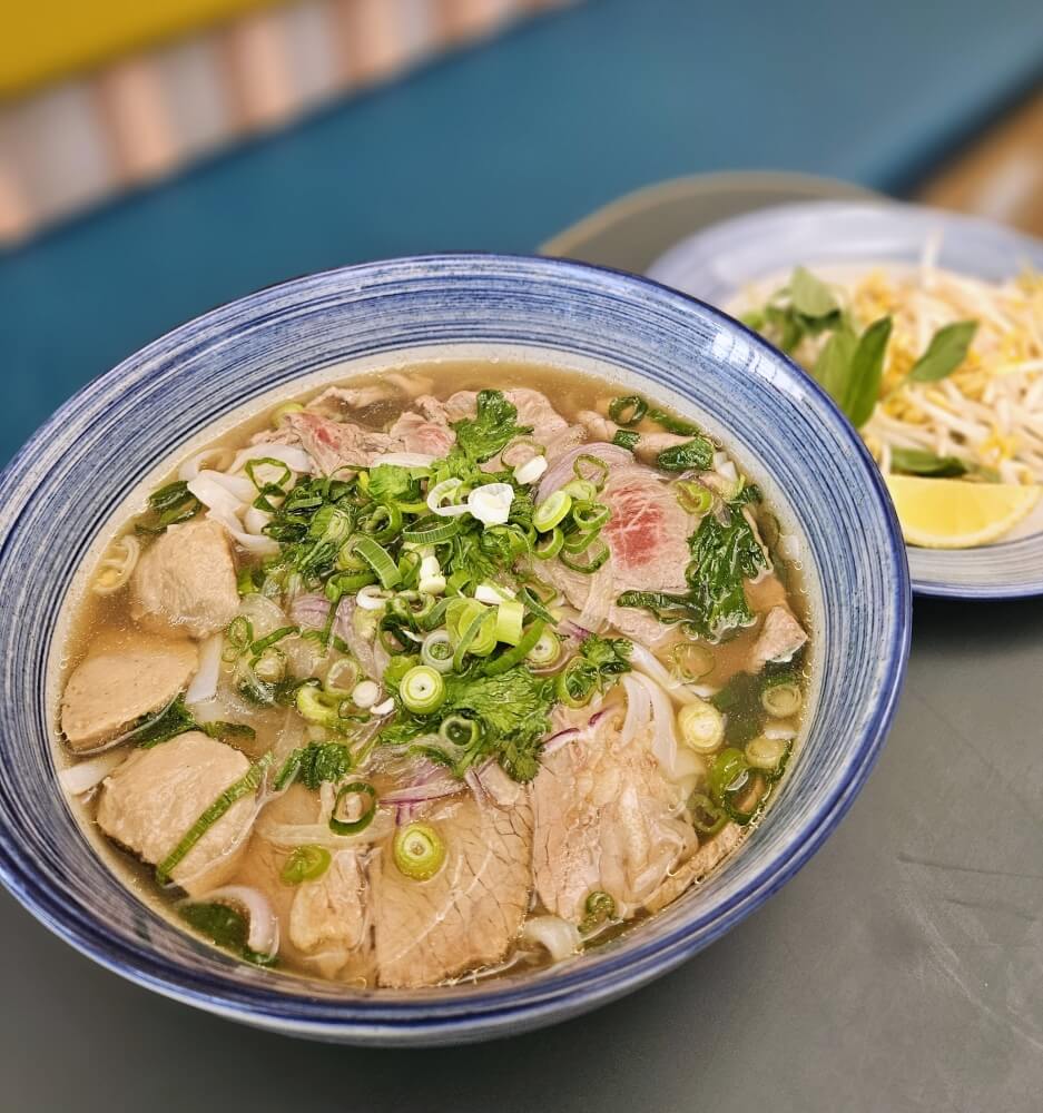 Tender sliced beef, beef brisket and minced beef balls with rice noodles and 12 hour beef bone broth topped with sliced red onion, spring onions and coriander. Served with a side of bean shoots, thai basil and lemon. Condiments include srirracha chilli sauce and hoisin sauce.